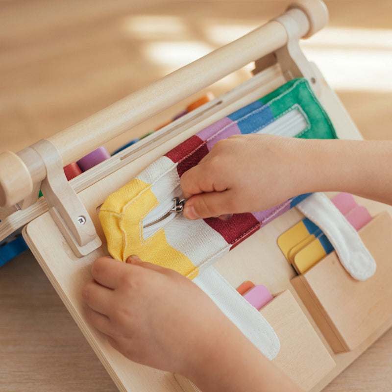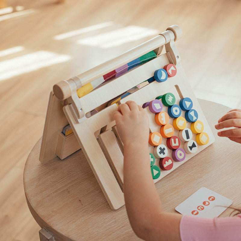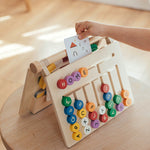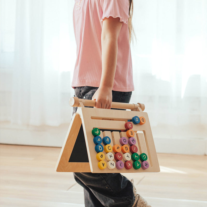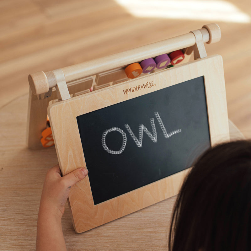 On the go, or at home, Spellbinder is the perfect toy for your child to play and learn. Spellbinder has four panels; spelling labyrinth with sliding letters, shape labyrinth with sliding shapes, a chalkboard that also serves as a portable writing & drawing surface, and storage pockets for cards, chalk, pencils, markers & more. Spellbinder helps teach spelling with 26 alphabet cards and 15 spelling cards, and sequencing with 12 shape cards. This all-in-one fun board folds completely flat that can be carried easily in the car, on a plane, or to a friend's house. Fall under the spell!