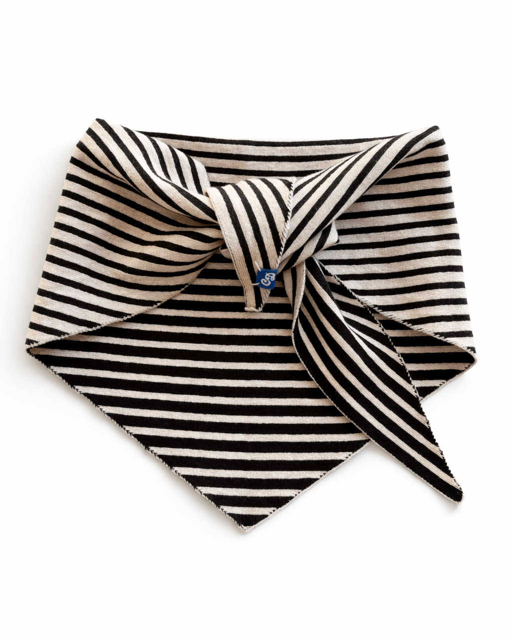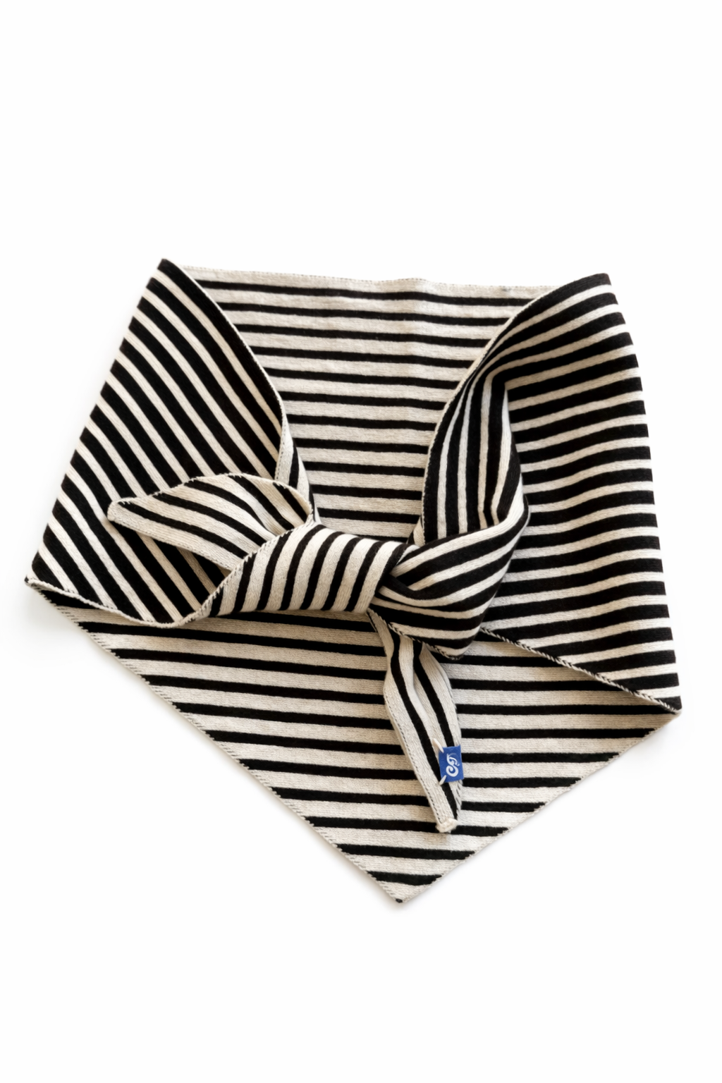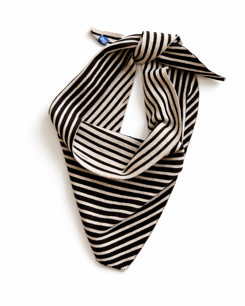 It's Babs - but better. The modern bandana scarf is now in stripes. Cut in a clean triangle shape, it wraps seamlessly or ties easily at the neck for a streamlined, sculptural finish. The Babs triangle scarf adds warmth and balance to any outfit - minimal, versatile, and a little bit unexpected.