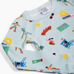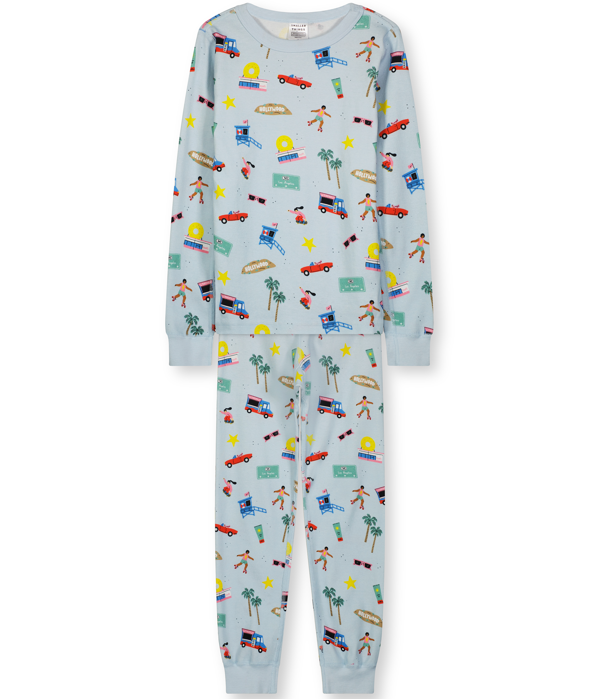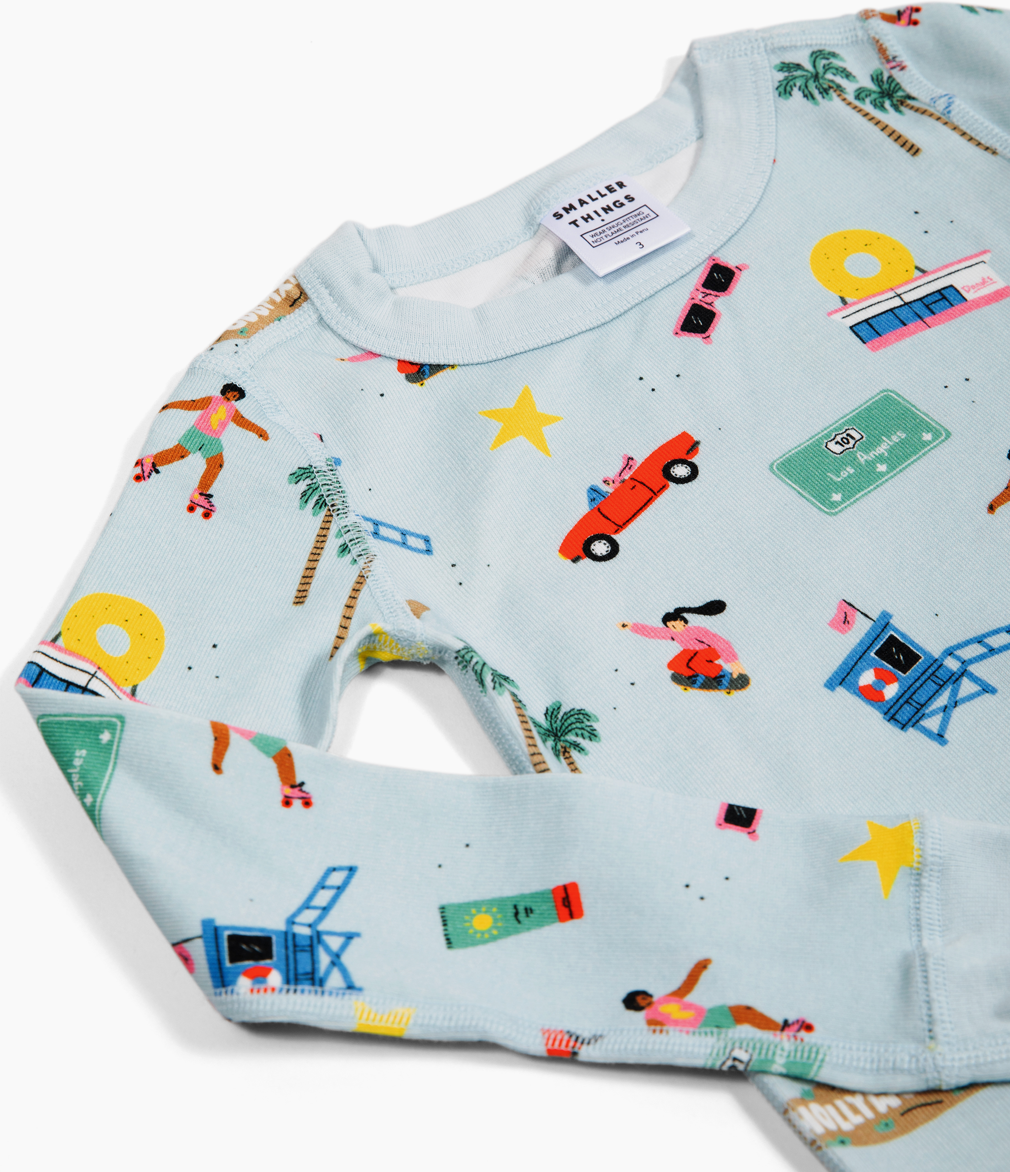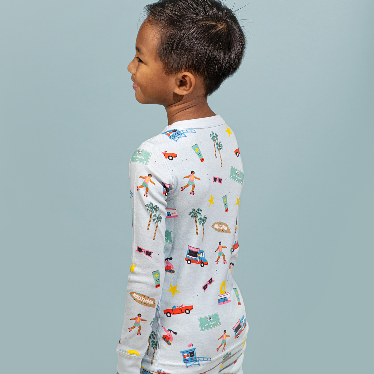 Laid-back dreams, West Coast style. This organic cotton PJ set feels like sunshine and ocean breeze — minus the sand. Comfy ribbed cuffs and an easy elastic waist make bedtime the chillest moment of the day. No screen time required.
